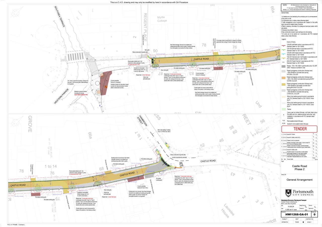 Work will commence at the Hambrook Street junction, before progressing South down Castle Road. While no night work is planned, there may be some initial Saturday work setting out traffic management or to help accelerate the project if access is required during certain phases. Consideration is currently being given to waste bins, with one proposed outside of the Castle Convenience Store.Cycle storage is also under consideration, in line with PCC and CRCA policies to encourage sustainable transport and reduce the carbon footprint.A temporary bay for loading and storage will be created in Kent Road, requiring some temporary parking suspension.There will be a Temporary Traffic Regulation Order (TTRO) to divert traffic and cyclists, with signs to make drivers aware of the work, changes to priorities and access during the work.There will be a Council and Colas contact number provided during the works to raise any urgent matters; with your Directors picking up any issues with them directly too, including at weekly site meetings. The CRCA is looking forward to organising events and markets for the local community to enjoy the new space in Castle Road once work is completed.